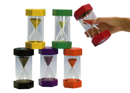 Комплект от 6 пластмасови пясъчни часовника, всеки отбелязващ различен интервал от време – 1 мин., 3 мин., 5 мин., 10 мин., 15 мин., 30 мин. Всеки часовник е с различен цвят на пясъка.
