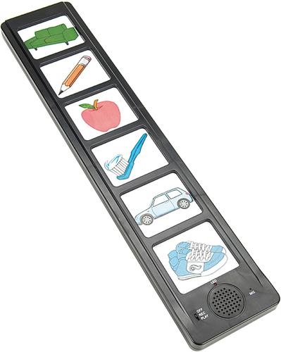 Апарат, записващ и възпроизвеждащ звуци / реч (рекордер). Звукът се записва към всеки отделен бутон (може да се изтрива и записва нов). По желание може да онагледите записаното с картинка или снимка по ваш избор (не са включени). По този начин може да съставите визуален план за рутинни (ежедневни) дейности, да разказвате история по серия картини или просто да обогатите активния и пасивния речник на детето. Продължителността на записа към всеки бутон от лентата е 10 секунди. Работи с 3 батерии ААА (не са включени).