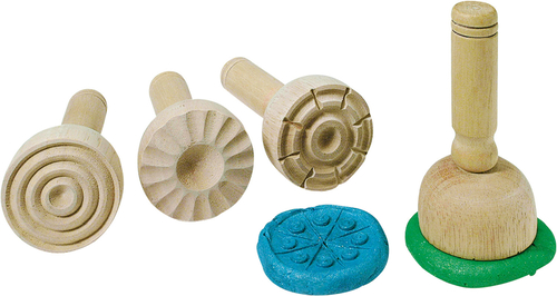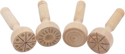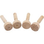 Комплект от 4 бр. дървени печати с релефни орнаментални глави и дълги дръжки. Размери: Глава: Ø 5,5 см Дръжка: Ø 2 см, дължина – 7,5 см