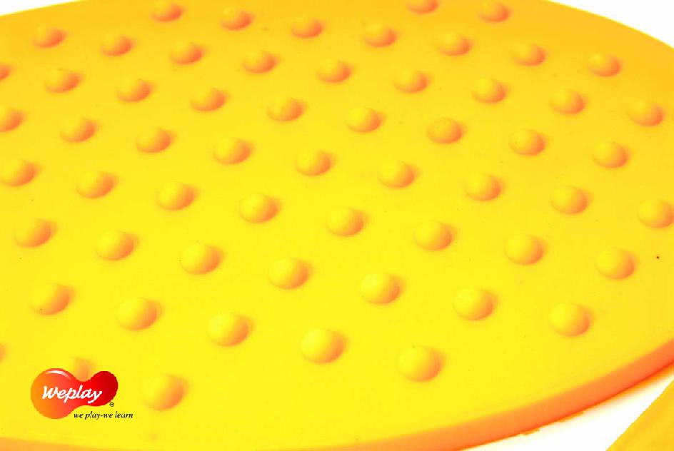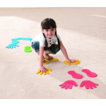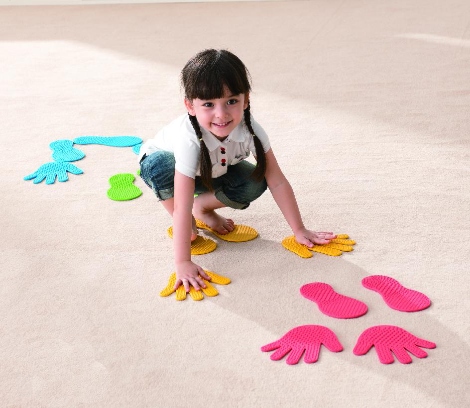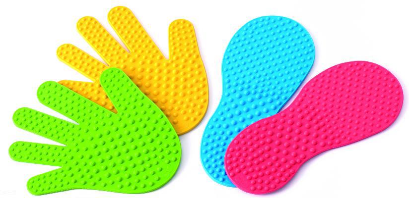 Комплект от релефни подложки във формата на ръце и крака за рамкиране на маршрут в подвижни игри за деца или тренировки. Релефната повърхност стимулира тактилно ръцете и краката при допир. Размерът и плътността на изпъкналите точки са проектирани с оглед на местоположението на нервите по крайниците. Подложките могат да се закрепват към пода, за да се предотврати подхлъзване. Противоплъзгащ материал.
