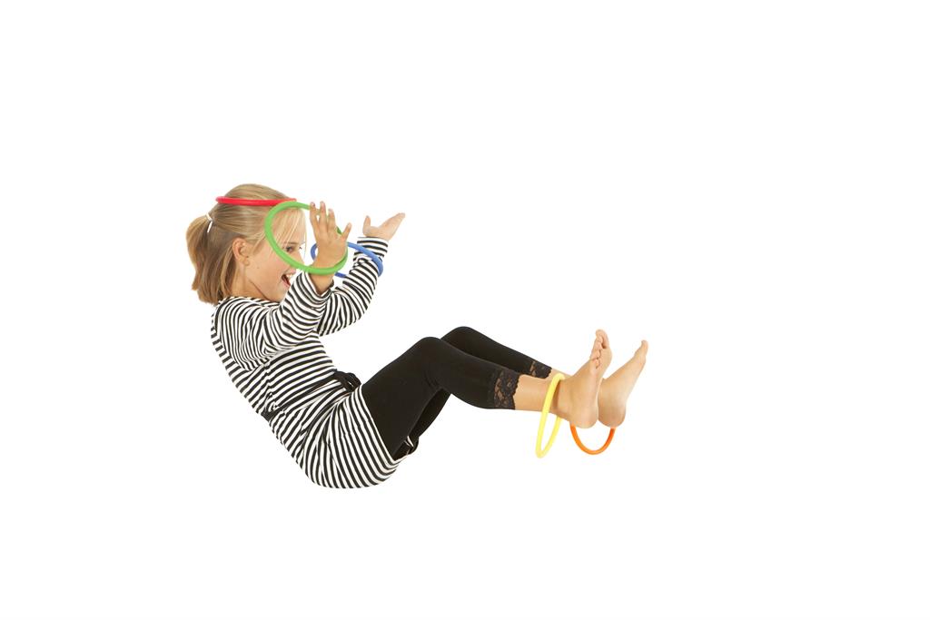 Комплект рингове в красиви ярки цветове. Могат да се използват за най-различни игри – индивидуално или в групи. Материал: мек изкуствен каучук Размери: диам. 16,4 см, височ. 1 см