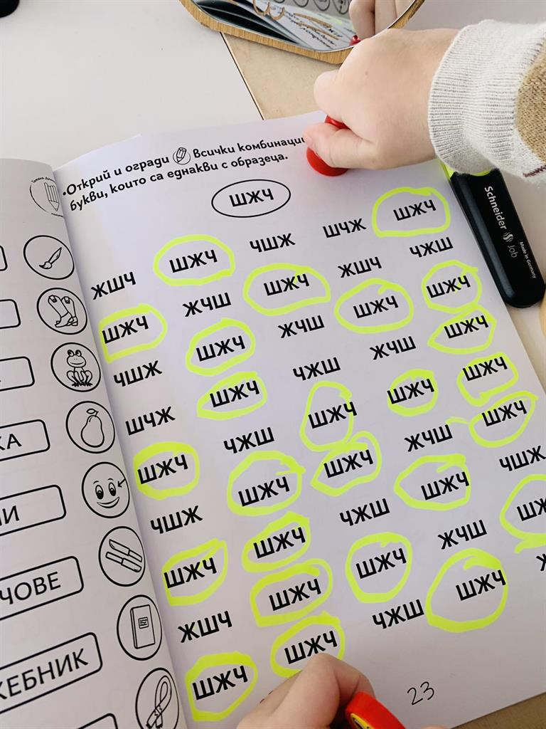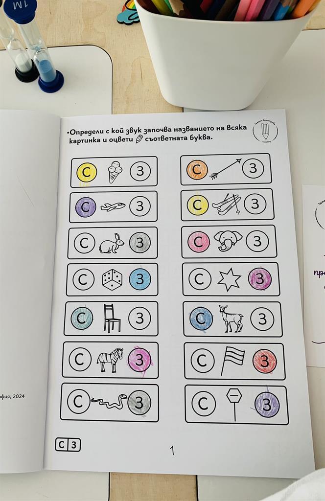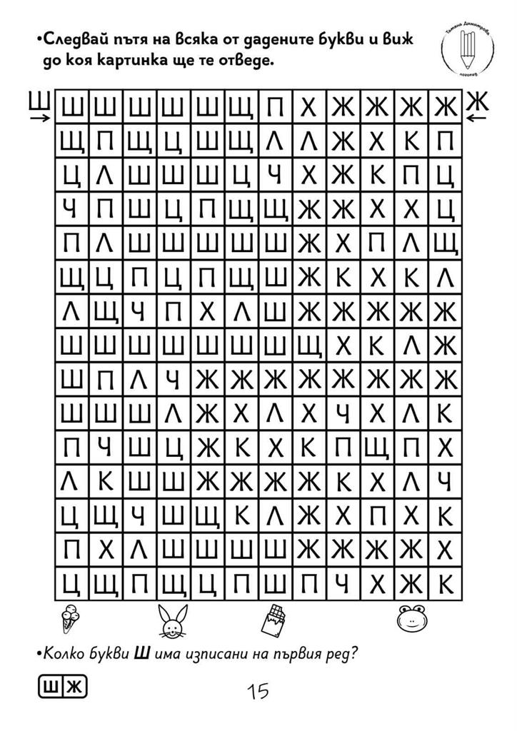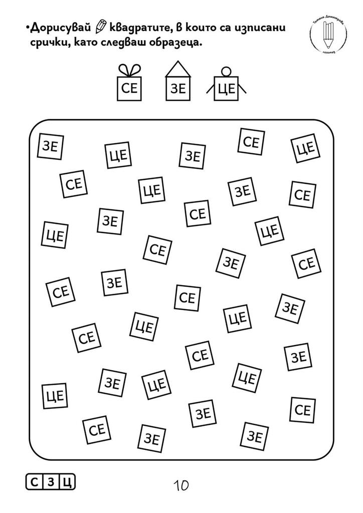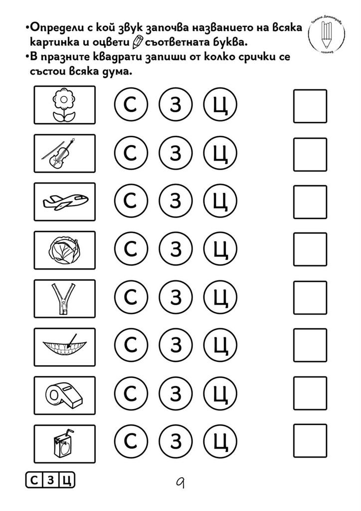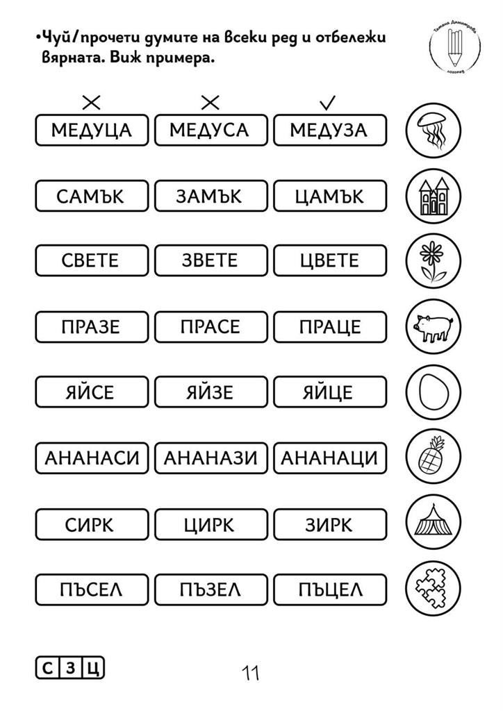 Съдържа 45 работни листа с интересни задачи за звукове, букви, срички, думи, изречения:– съгласни звукове със сходни акустични характеристики: С-З-Ц / Ш-Ж-Ч / Р-Л