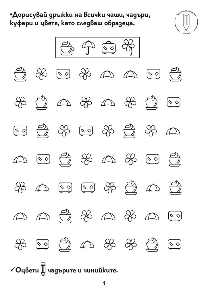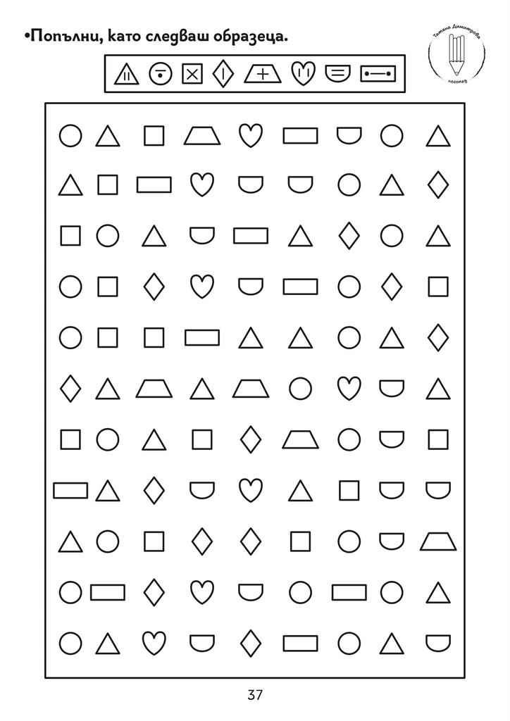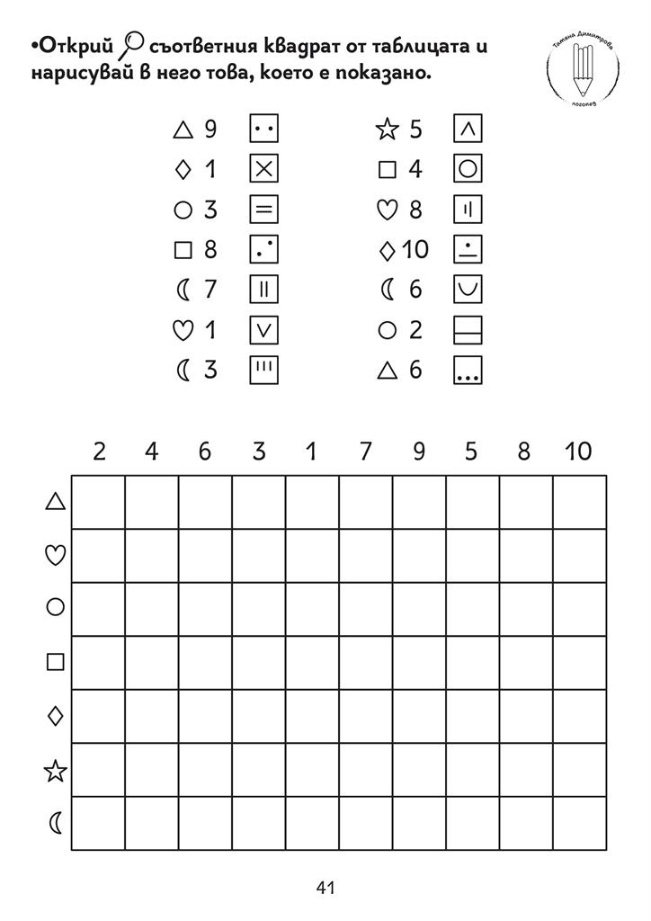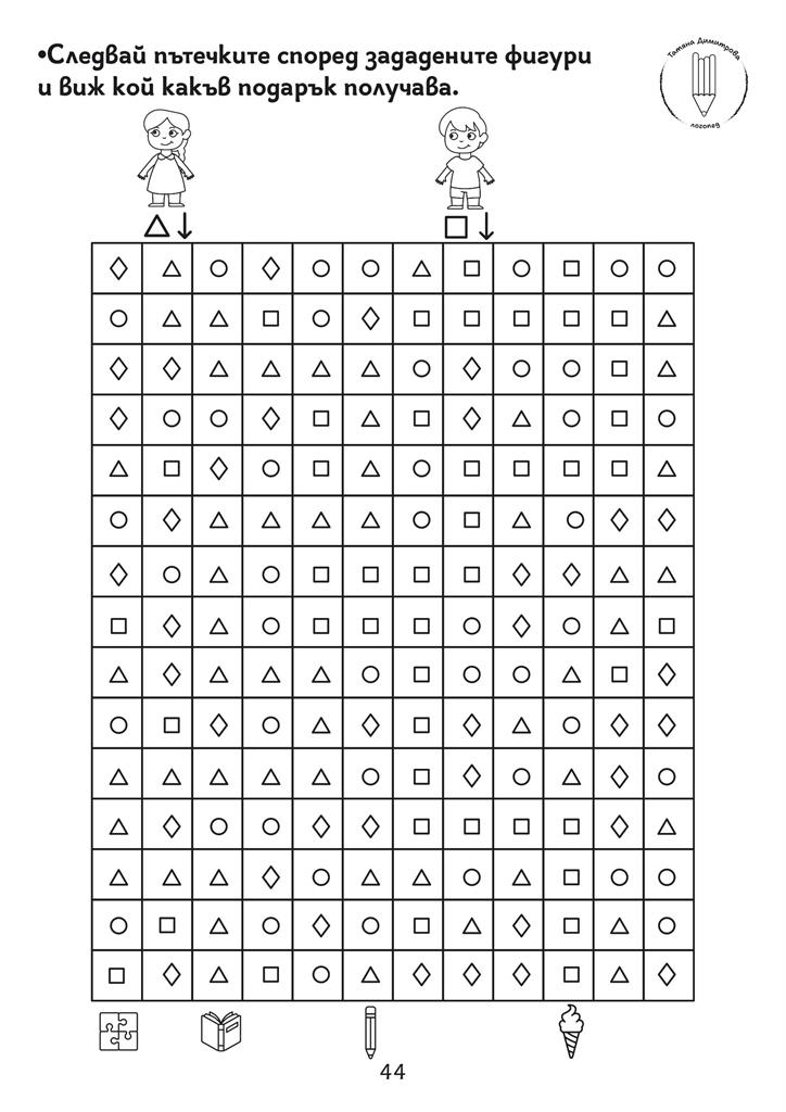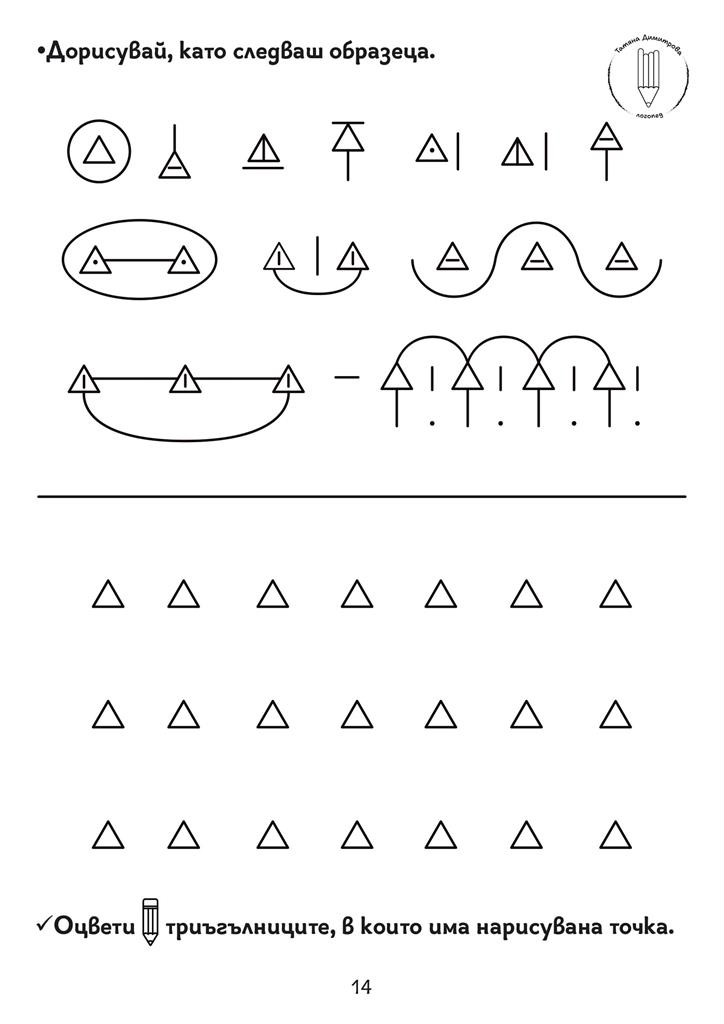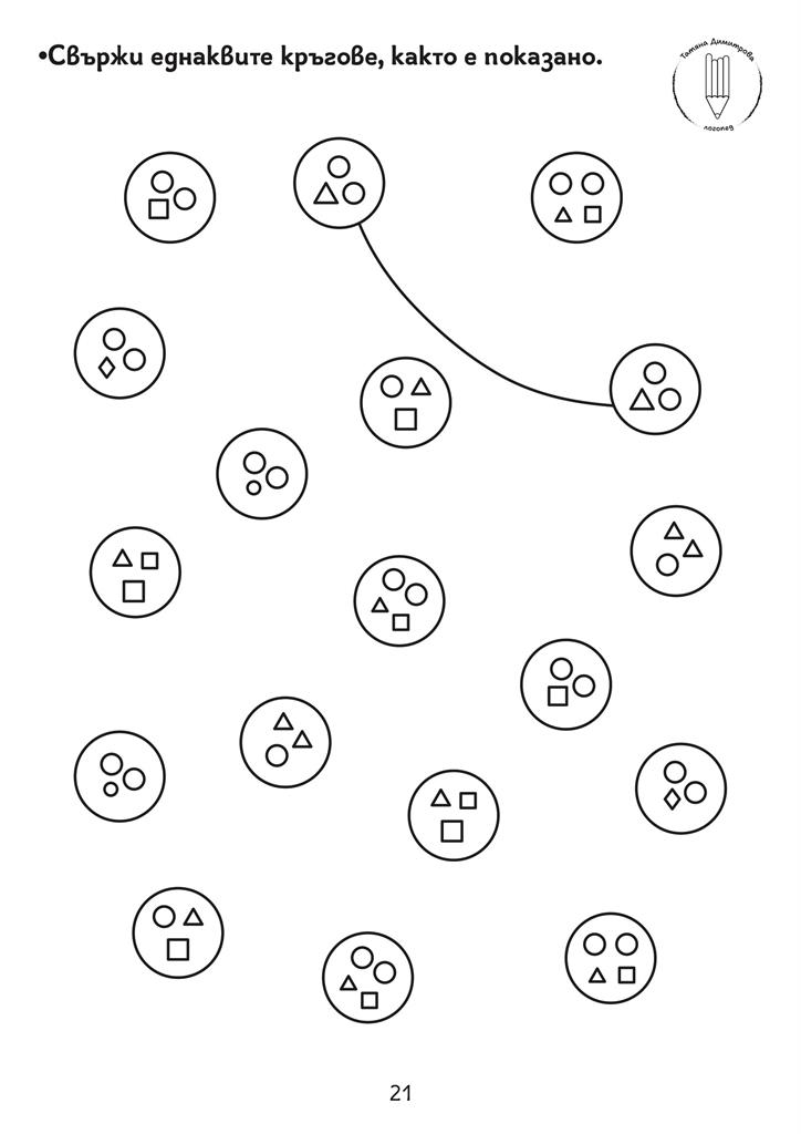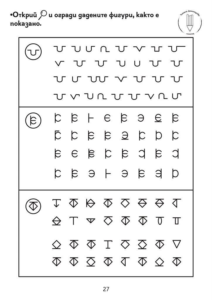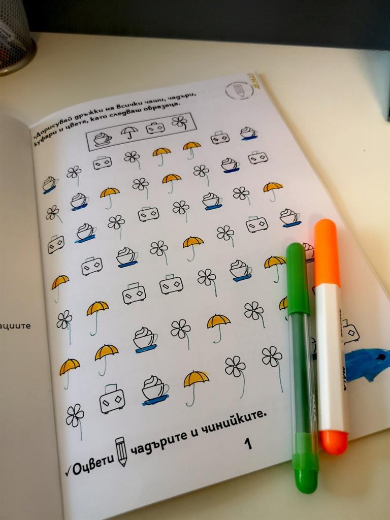 Помагало с авторски илюстрации и задачи за развитие на концентрацията на вниманието, наблюдателността, графомоторните умения, пространствените и зрителни възприятия. Подходящо за деца със специални образователни потребности. Черно-белият формат дава възможност да се пише и оцветява в сборника. Следването на поредността на задачите в помагалото Не е задължителна.