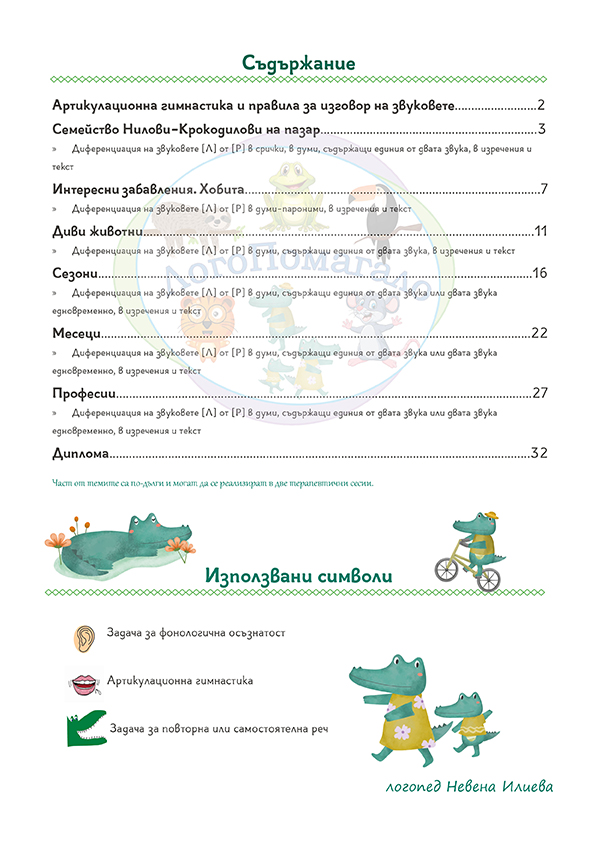 „Семейство Нилови–Крокодилови и звуковете [Р] и [Л]“ е логопедично помагало, създадено за подпомагане на диференциацията на звуковете [Р] и [Л]. Второто преработено и допълнено издание е значително разширено – с 20 страници повече от първото – и включва нови игри, карти и упражнения. Всички задачи са богато онагледени и поднесени в игрова форма, което поддържа интереса и улеснява усвояването на езиковия материал. Подходящо е както за логопедичния кабинет, така и за работа у дома под супервизия на специалист.