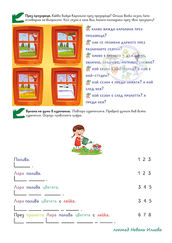 + Тематични раздели: „На пазар“, „Диви животни“, „Хобита“, „Сезони“, „Месеци“, „Професии“