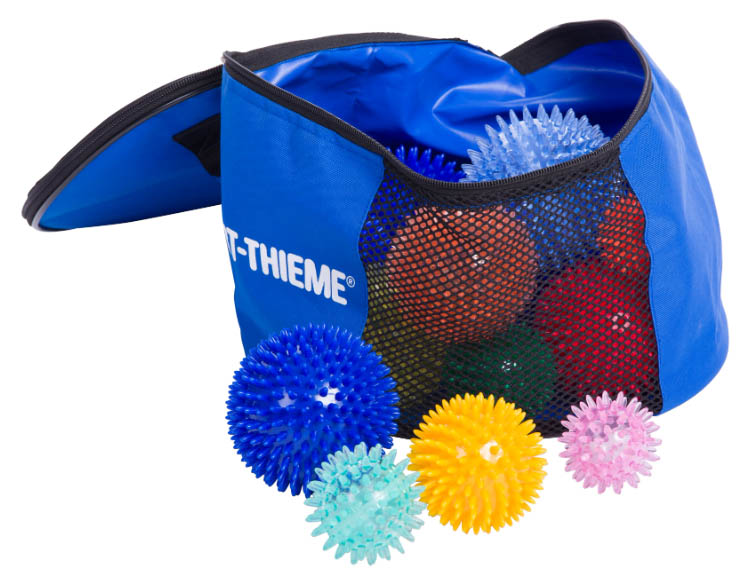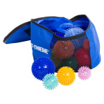 Комплект от 22 масажни топки с различни размери и твърдост. В терапията и гимнастиката малките пластмасови топки се използват за отпускане на мускулите и стимулиране на кръвообращението. В допълнение, топките с бодлички служат за насърчаване на възприятието и чувствителността при възрастни хора и хора с увреждания.