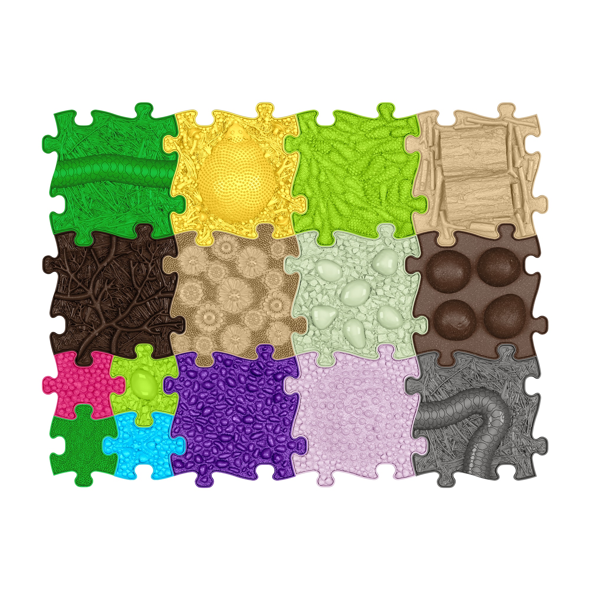 Комплект тактилни пъзел плочи, предназначени специално за превенция и рехабилитация на валгусни деформации на стъпалата, глезените и коленете, плоскостъпие, ниски сводове на стъпалата, отслабени ставни връзки при децата. Комплектът включва гъвкави цветни пъзел плочи с различни текстури и релеф и в две степени на твърдост (меки и твърди). Това позволява бързо и лесно сами да проектирате сензорните предизвикателства според нуждите и желанията. Играта и ходенето върху релефните пъзел плочки помагат за правилна походка и цялостно развитие на стойката, особено за укрепване на центъра на тялото.