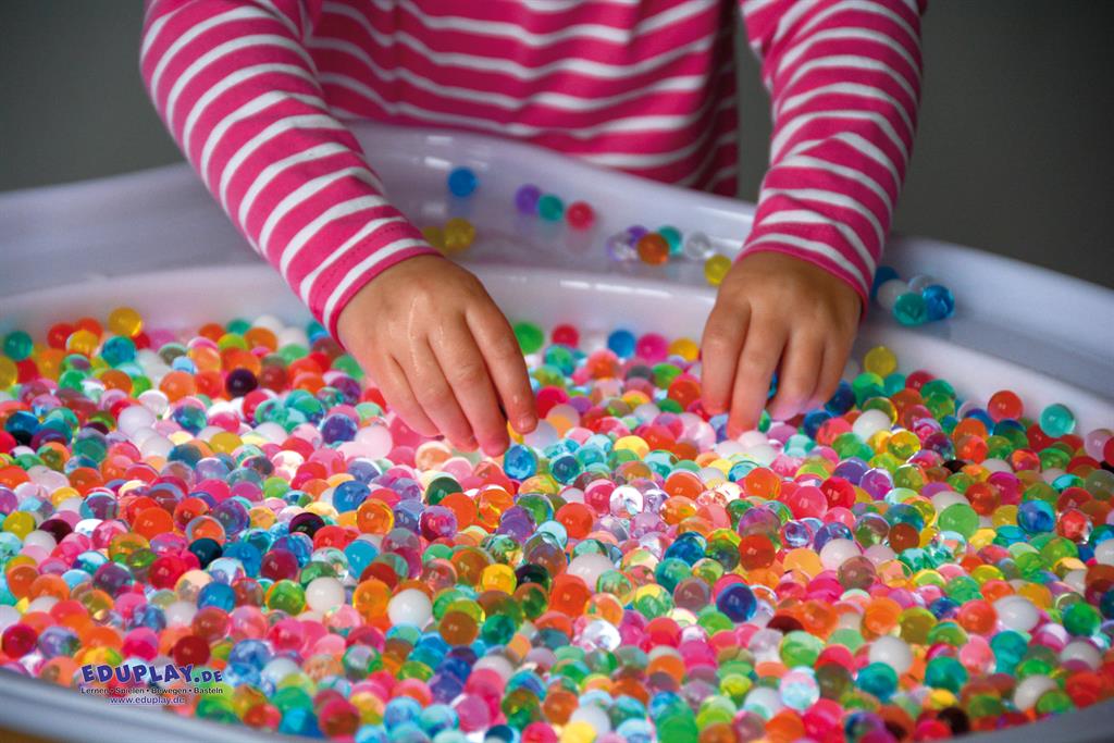 Серзорните перли са толкова примамливи и вънуващи – както за гледане, така и за докосване. Сложете малко количество от сухите гел перли в съд с вода. Те ще я попият бързо и ще увеличат обема си. Забавлението може да започне! Скрийте малки предмети в съда и накарайте детето да ги открие чрез опипване с ръце или крака. Ако съдът е прозрачен, поставете го върху светещ панел и перлите ще засияят! Ако желаете да тренирате фината моторика и ловкостта на пръстите, опитайте да изваждате перлите с пръсти или с щипки или пинсети.