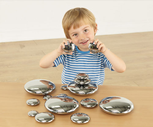 Изключително стимулиращи и впечатляващи, когато децата са в състояние да възприемат заобикалящата ги среда и себе си от различни гледни точки. Съдържание / материали: 20 огледални камъка от пластмаса Размери: Ø 4,5 – 15 см