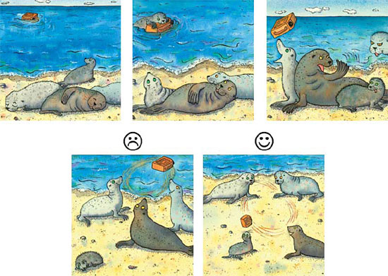 Комплектът съдържа 13 истории в цветни картини, чиито главни персонажи са различни животни. Те пресъздават модели на човешко поведение, свързано с насилие и тормоз. Животните са избрани за главни герои в историите, за да не бъде представяно насилието прекалено директно и отблъскващо. Опитът показва, че децата лесно се идентифицират с героите животни и по този начин са насърчени да разсъждават върху илюстрираните ситуации. Освен това животните позволяват да се говори неутрално по отношение на пола и произхода на персонажите и да не се акцентира върху определени малцинства (раса, религия и т.н.).