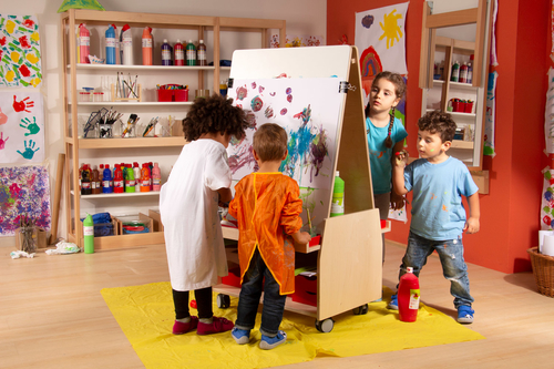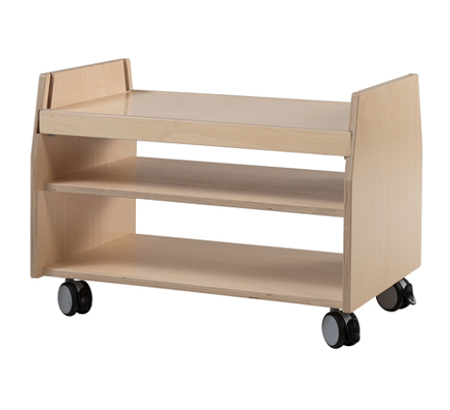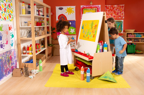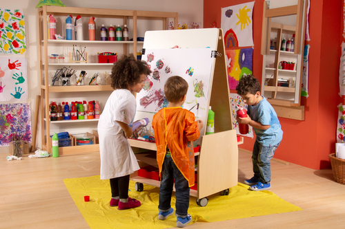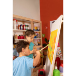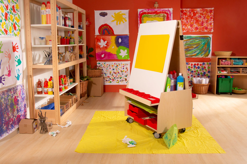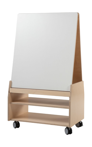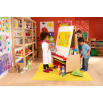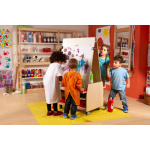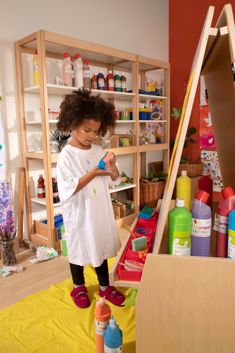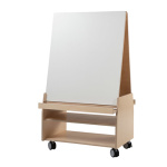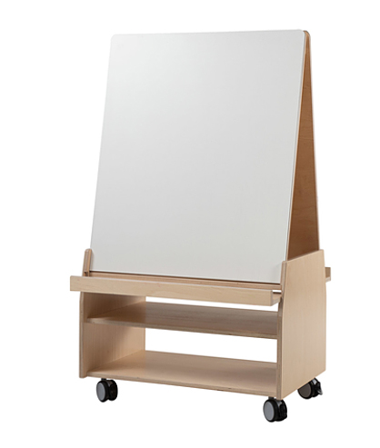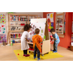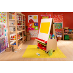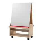 Подвижна станция за рисуване за малки художници. Може да се използва от двете страни и предлага място за съхранение на творчески материали. Стената за рисуване може да се маха и сгъва. От двете страни има издърпващи се рафтове, които могат да служат и като допълнително място за материали. В тях могат да се поставят червените пластмасови ванички. Те се мият лесно и могат да се поставят в долната част на модула, когато не се използват или когато рафтовете са прибрани. С 4 заключващи колелца. На модула могат да се съберат 2 червени пластмасови вани (включени в комплекта) и 3 дървени кутии за материали (402110 – не са включени, може да се поръчат отделно).
