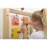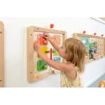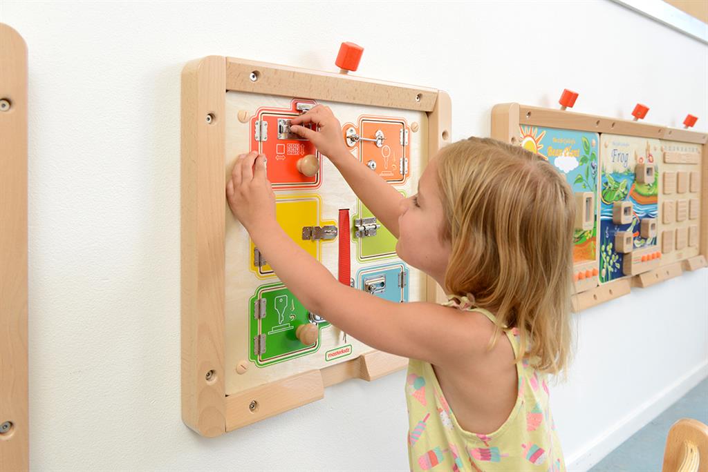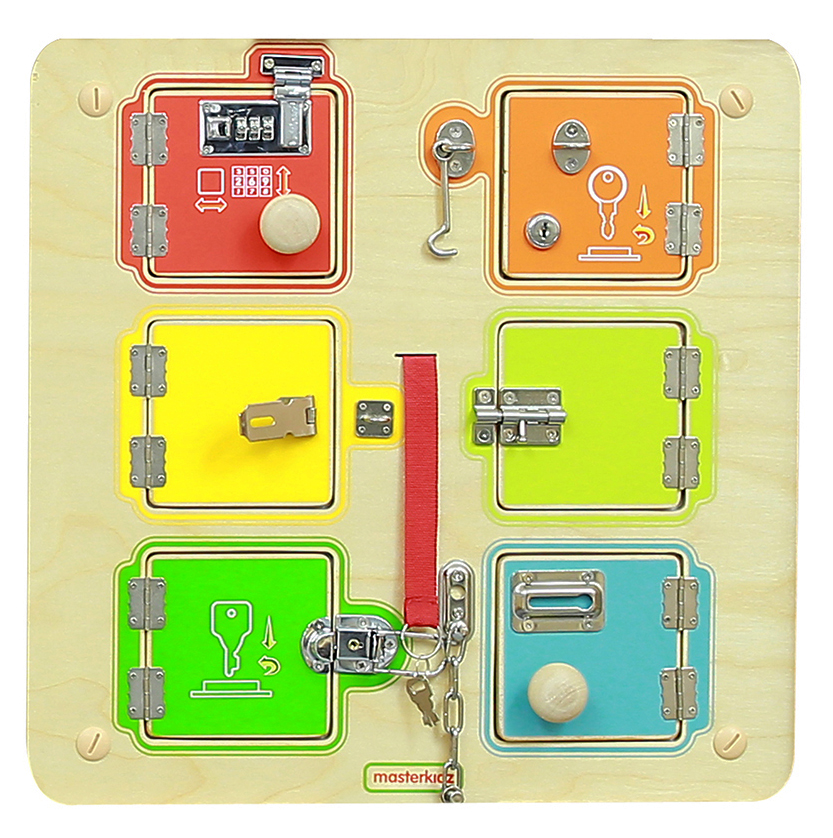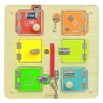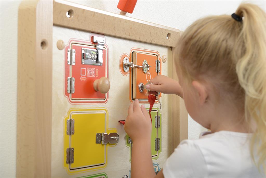Стенният панел с ключалки и вратички е интерактивна игра, която съчетава любопитството на децата с практическо обучение. Чрез отваряне и затваряне на различни механизми децата откриват какво се крие зад всяка вратичка, като едновременно с това развиват важни умения от ежедневието. Панелът предлага възможност за включване на снимки, символи или съобщения, което го прави подходящ и за образователни и терапевтични дейности.