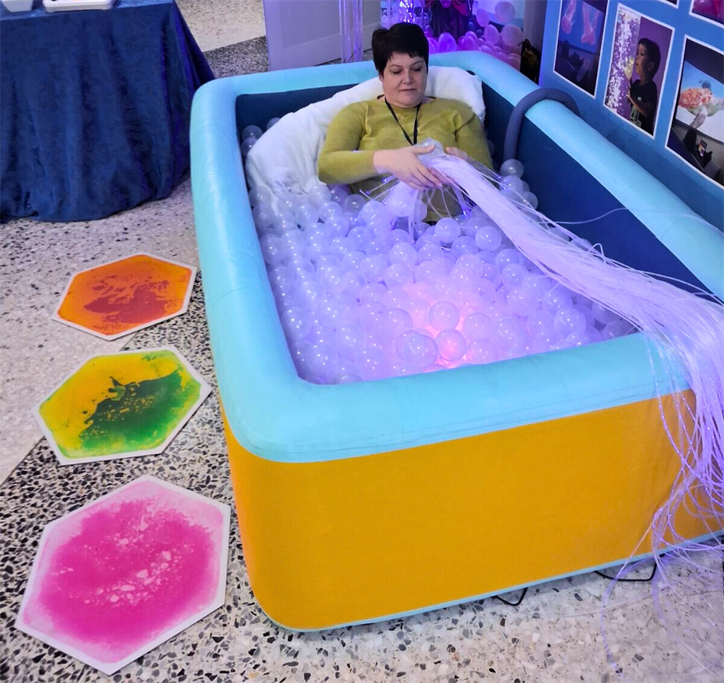 Сухият терапевтичен басейн за топки е висококачествено сензорно съоръжение, създадено за релаксация, дълбока проприоцептивна стимулация и безопасна игра. Изработен от изключително здрав drop-stitch материал и фталат-свободно PVC, този модел предлага стабилност и дълготрайност, които значително надминават стандартните надуваеми изделия. При напълване басейнът стои твърд, устойчив и сигурен, подходящ както за деца, така и за възрастни.