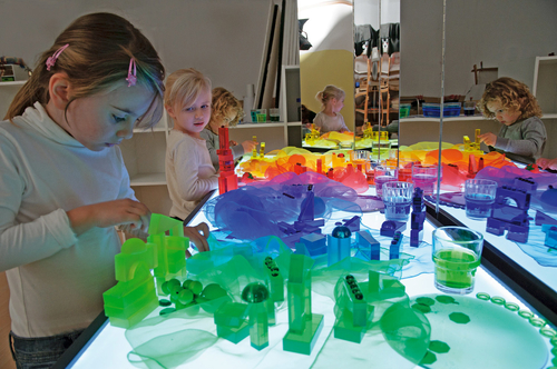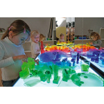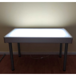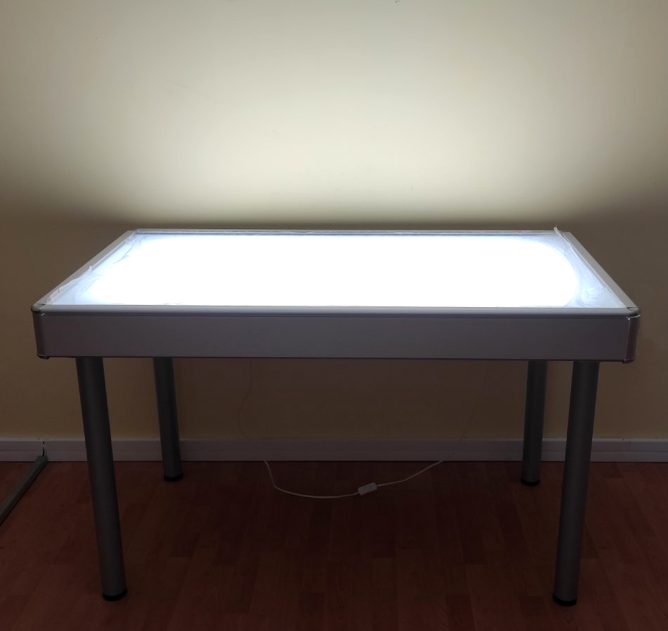 Маса със светещ плот, осигуряваща достатъчно пространство за творчество и откривателство. Тя може да се използва както от група, така и самостоятелно. Масата е особено подходяща за експерименти с цветове – комбинации на различни предмети, мъниста, камъчета, шалове, акрилни строителни блокчета, природни материали…. В комбинация със стенно огледало (например Акрилно огледало BLA2027) визуалният ефект ще бъде още по-вълнуващ и зашеметяващ! Осветената площ може да се ползва и като място за презентации.