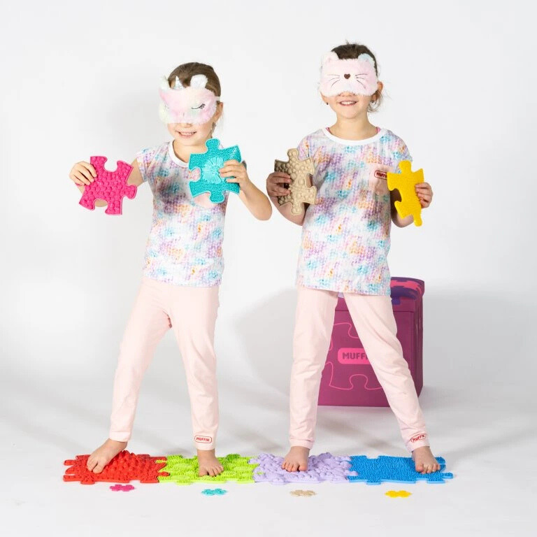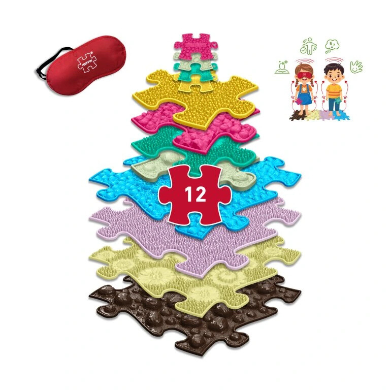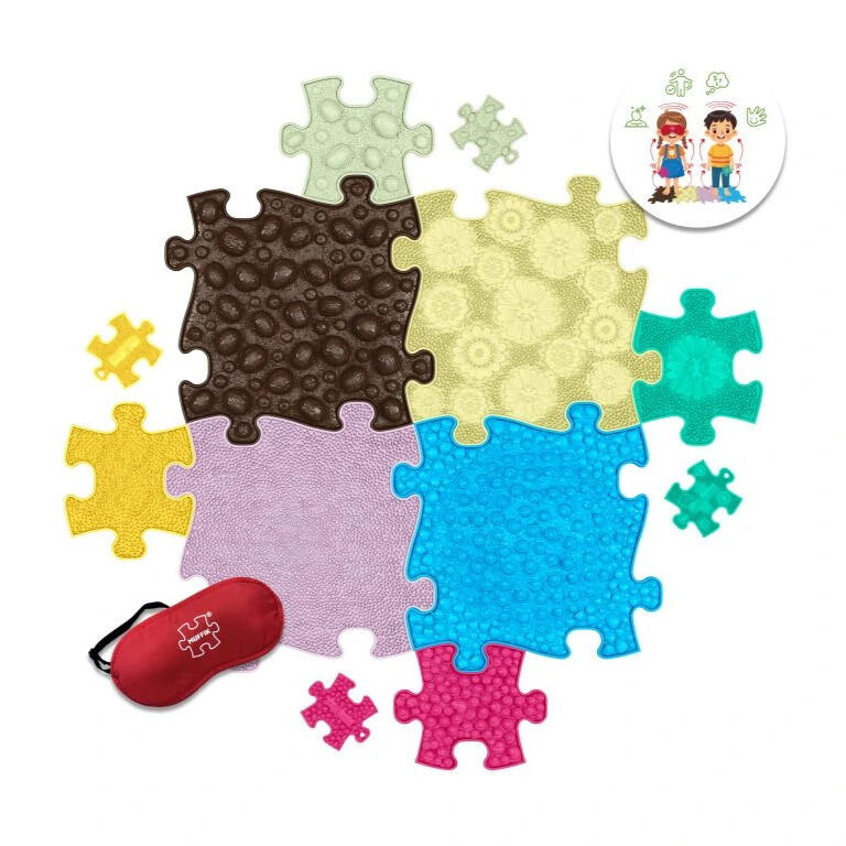 Тактилна мемори игра за пода е забавна и полезна игра за развитие на вниманието, паметта и сетивността. Децата трябва да съпоставят и открият елементите, които имат еднакъв релеф и тактилна повърхност. Пъзел елементите, включени в комплекта, са с различни цветове и в 3 различни размера. Това дава възможност на децата да опознаят цветовете и да съпоставят различните големини, като едновременно с това стимулират тактилните възприятия на ръцете и краката си.
