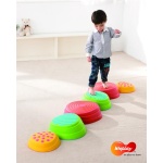 Съдържание / материали: Комплект от 6 броя платформи с релефна повърхност, наподобяващи големи речни камъни: 2 големи, 2 средни и 2 малки. Изработени са от мека пластмаса с нехлъзгава повърхност отдолу и релефна отгоре. Товароносимост: до 80 кг.