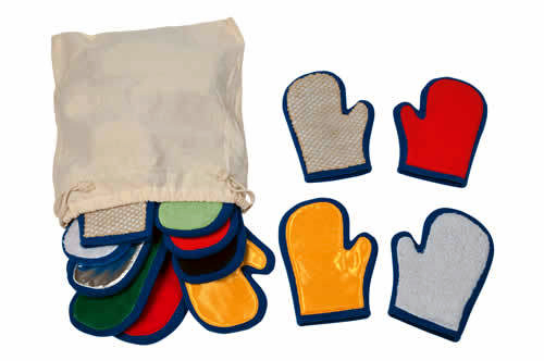 Комплект от 10 чифта ръкавици с различна текстурирана повърхност. Изключително подходящи за стимулиране на тактилните възприятия. Насърчава се социалното взаимодействие, езиково-говорното развитие, емоционалната експресия.
