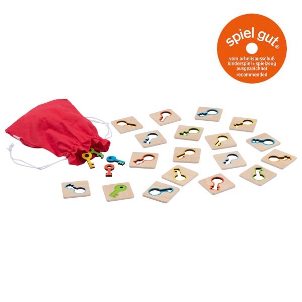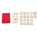 Мемори играта „Търсене на ключове“ е динамична дървена игра за наблюдателност, бърза реакция и концентрация. В комплекта всяко ключе има точно едно съответствие сред плочките, което превръща играта в истинско предизвикателство. Децата теглят ключ от торбичката и се състезават кой първи ще открие правилната плочка. Цветните елементи улесняват ориентацията и правят играта още по-ангажираща и забавна.