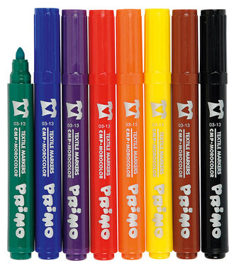Цветни флумастери за рисуване върху светъл текстил. Изперете плата преди нанасяне, след това гладете от обратната страна. Перете при температура на водата до 40°C.