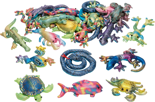 Комплект от 24 тежки играчки животни (напр. жаба, риба, крокодил, гущер, змия, костенурка, омар, рак), изработени от плат, пълни с пясък Размери: жаба 8 х 10,5 см