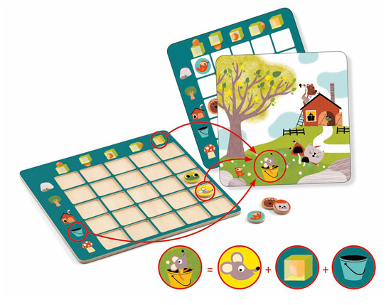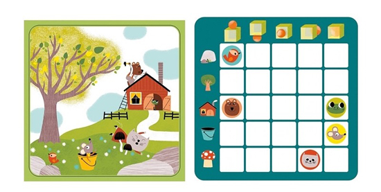 Къде е жабката? Тя е в къщата.А къде е мишката? Тя е в кофата?Забавна игра, в която децата трябва да определят позицията на 5-те животни, съобразявайки се с 5-те елемента на таблата. Лесен и забавен начин да запознаете децата с пространствените отношения и употребата на предлози за място.