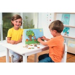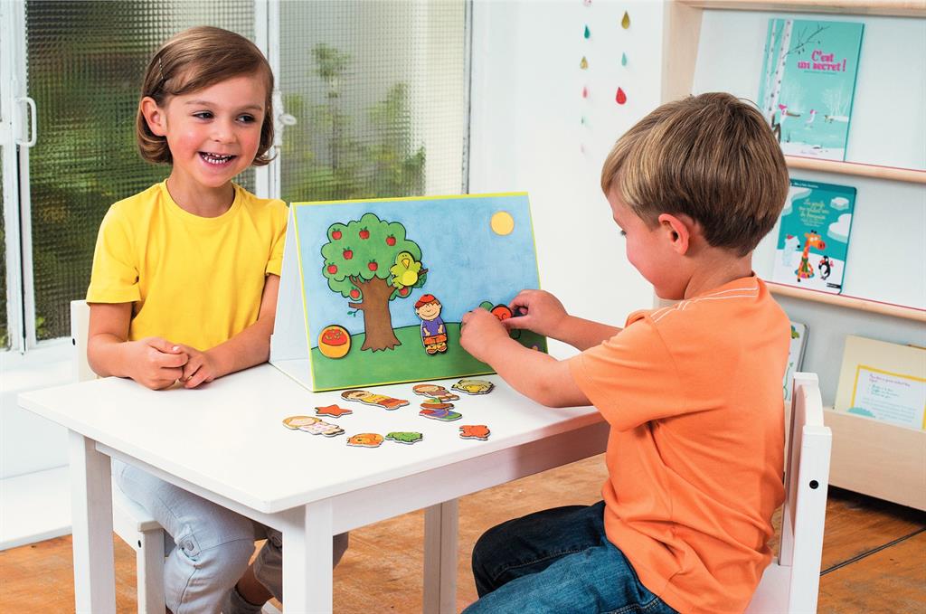 Децата работят по двойки: едното описва сцената, а другото следва инструкциите и подрежда фигурките, като използва думи, обозначаващи пространствени отношения – върху, под, пред, зад, до, в и др.
