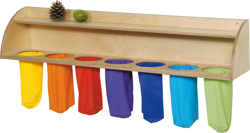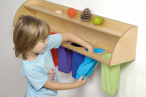 Предложения за игра: Толкова много неща могат да бъдат скрити в цветните тактилни торбички. Децата трябва да познаят какво има в тях само като ги опипват отвън. Платът е достатъчно тънък, за да получат различни впечатления от допира. Може да оставите върху перваза на стойката предмети като тези в торбичките, като по този начин ще помогнете на децата да ги идентифицират.