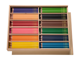 Голям комплект цветни моливи в дървена кутия. Триъгълната форма улеснява правилния трипръстов захват на молива.