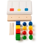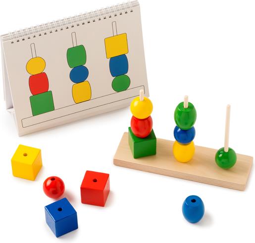 Съдържание: поставка с 3 пръчки, 12 дървени фигури в 3 цвята, книжка с модели 12 страници