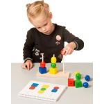 Игра за сортиране по цветове и форми. Може да се използва за свободна игра или за следване на моделите, показани в приложената книжка.