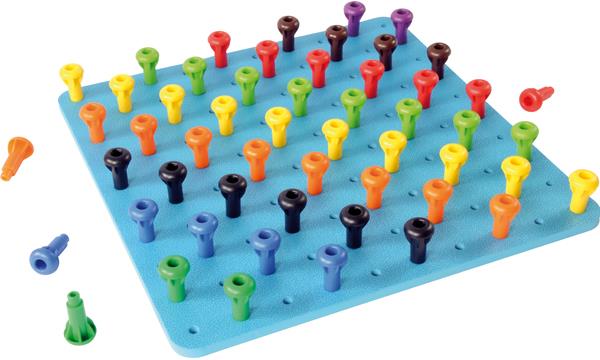 Цветните пластмасови пирони могат лесно да се поставят в подложката от пенопласт и отново да се извадят. С тях могат да се направят страхотни фигури, като дори могат да се поставят едни върху друг. Освен подложката и цветните гвоздеи, комплекта съдържа и 10 броя цветни кутии за сортиране.