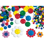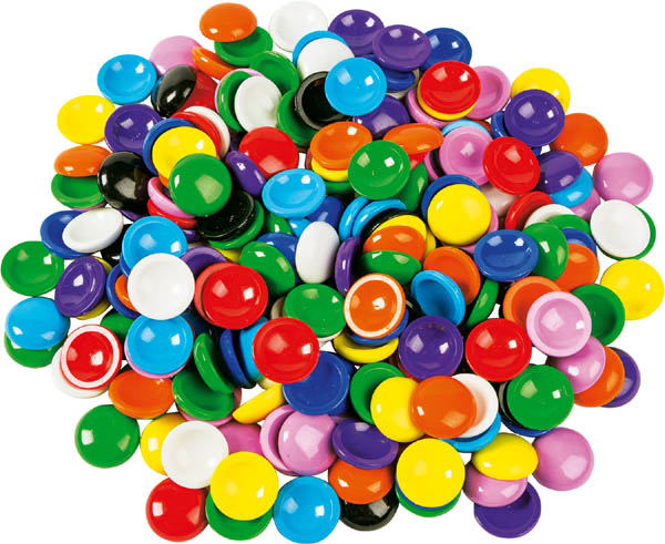 Кръглите камъчета са изработени от висококачествена пластмаса в 10 възхитителни цвята. Около 1 камъче винаги се събират 8 камъчета от по-малкия размер. Съдържание: 1 кг / около 650 бр. в найлонова опаковка Размери: диаметър 19,5 мм