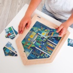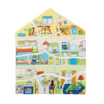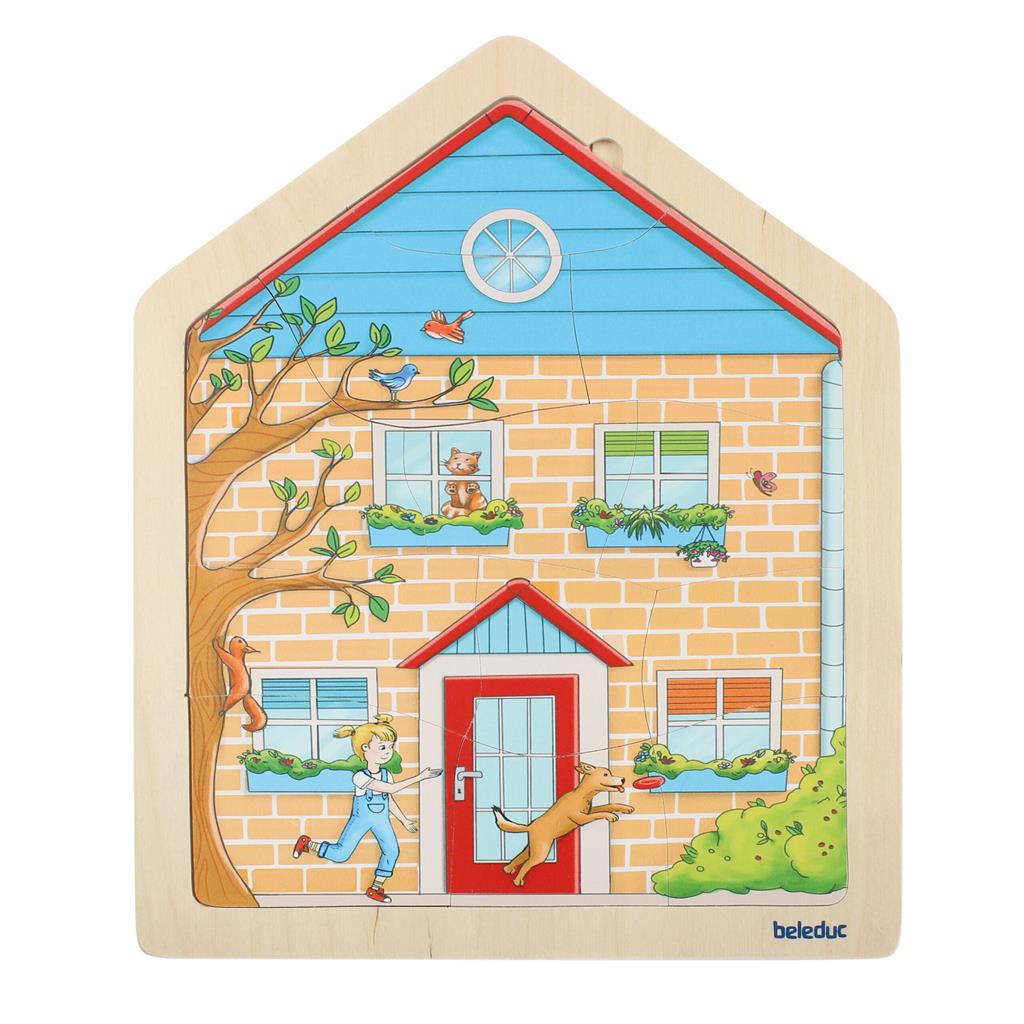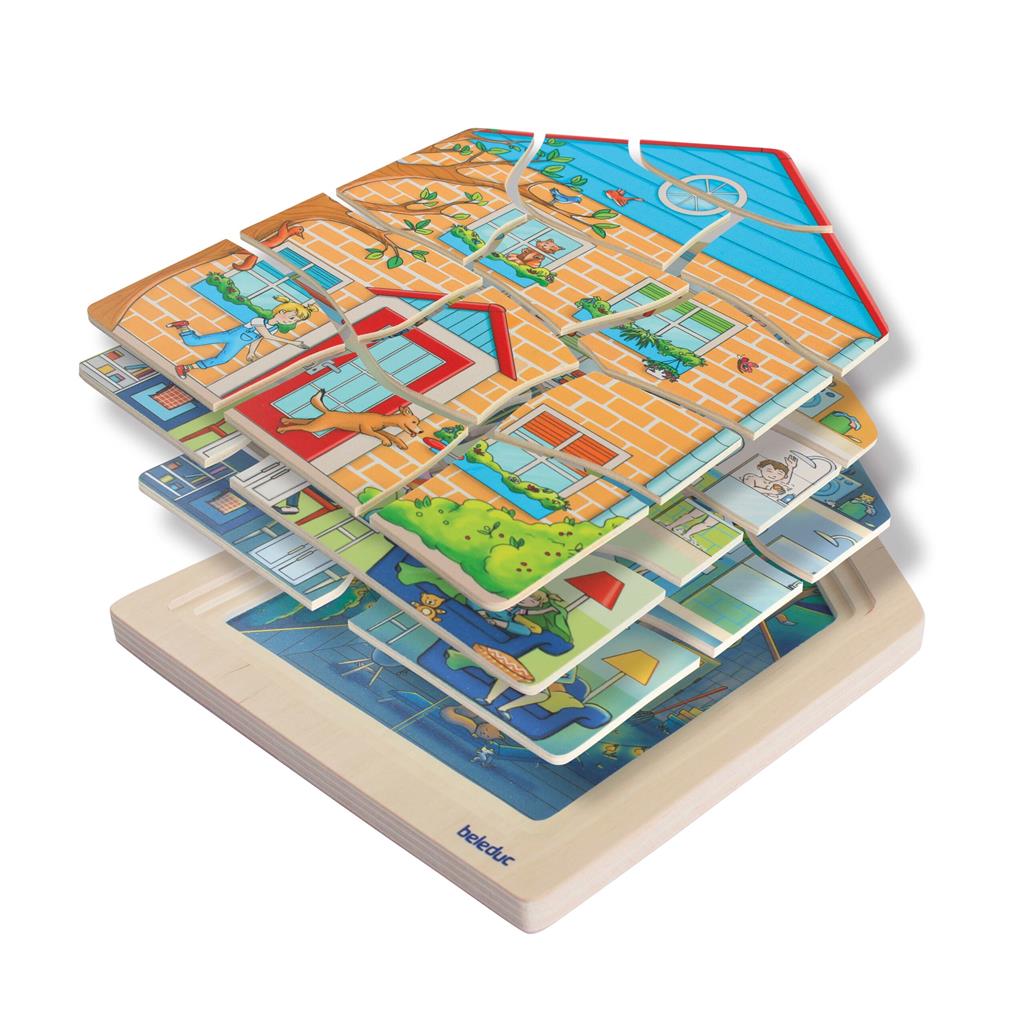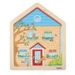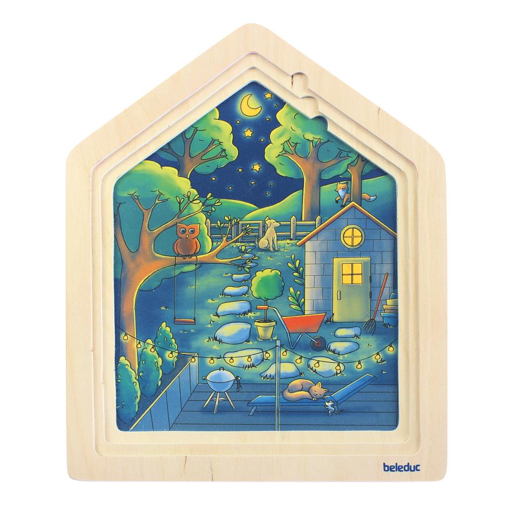 Многослоен пъзел на тема „У дома“. Представя различните дейности на обитателите през различно време от деня. Пъзелът с тъмната градина има дори светещ ефект.