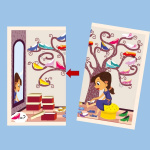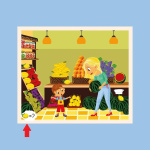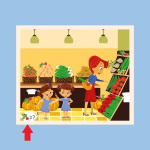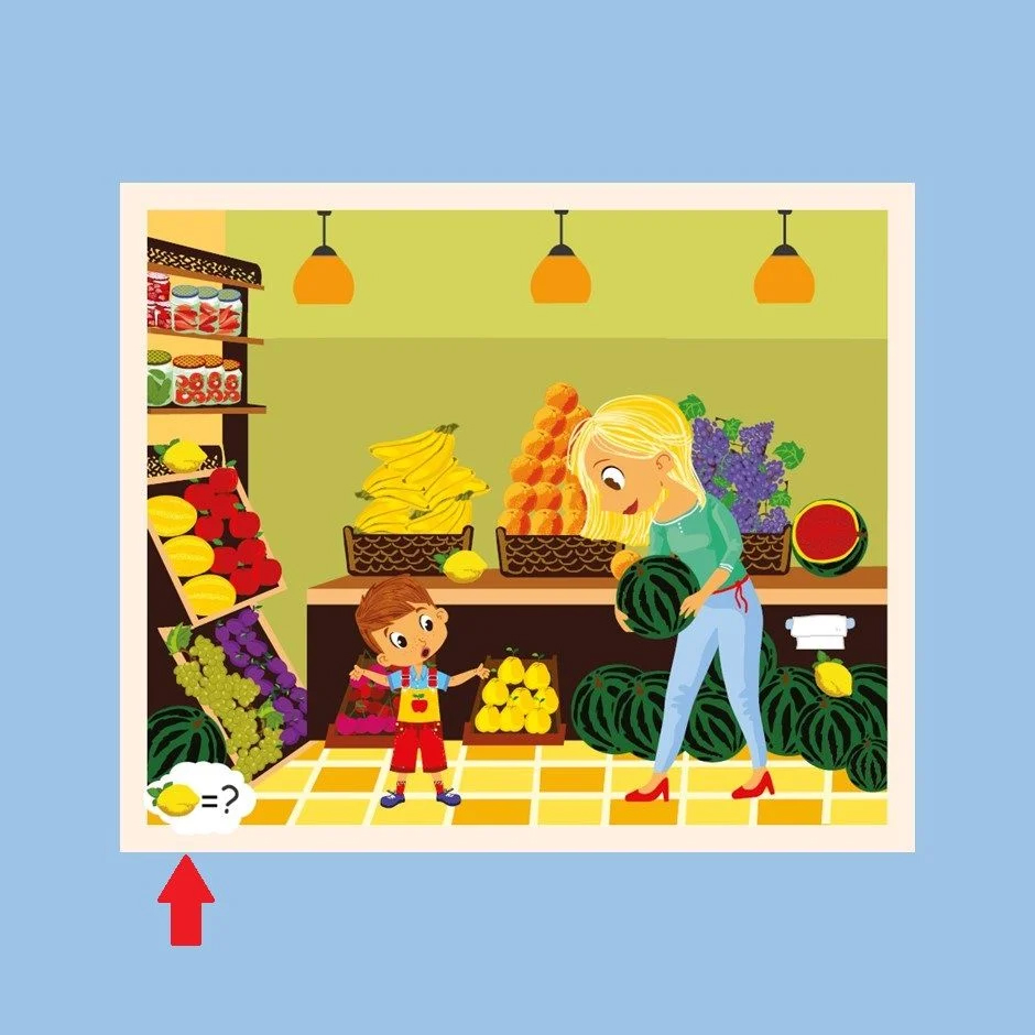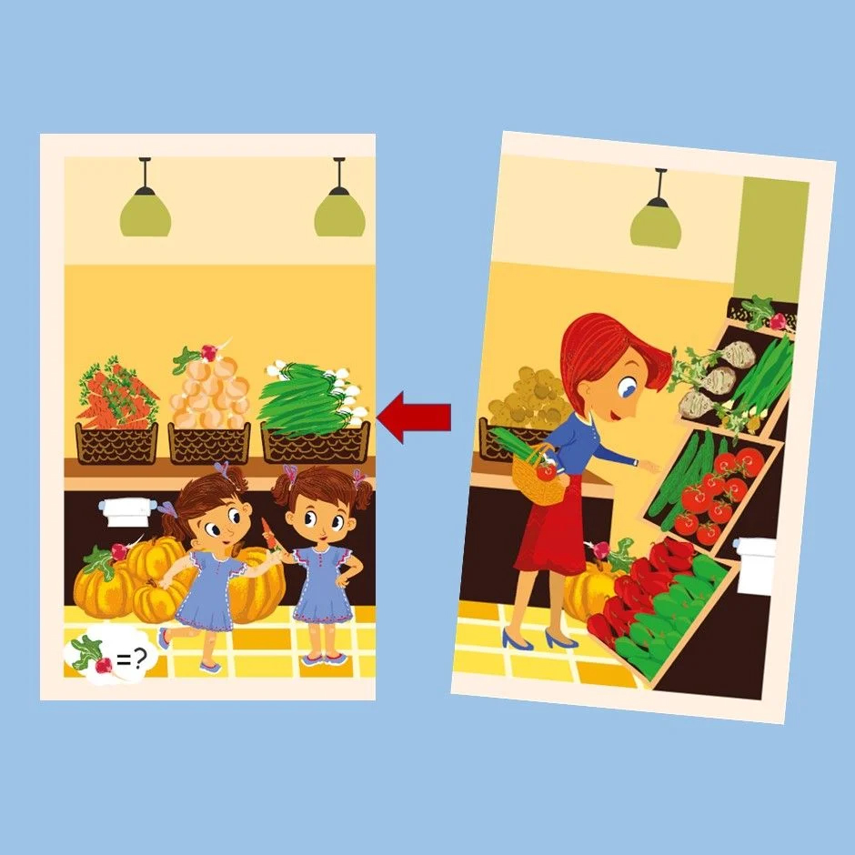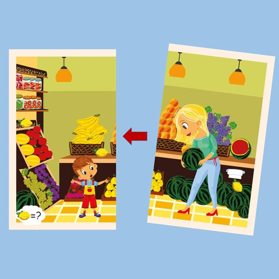 С картите в този комплект детето може да построи цял търговски център, в който има различни магазини – за плодове и зеленчуци, за хранителни продукти, за обувки и дрехи, и дори книжарница!