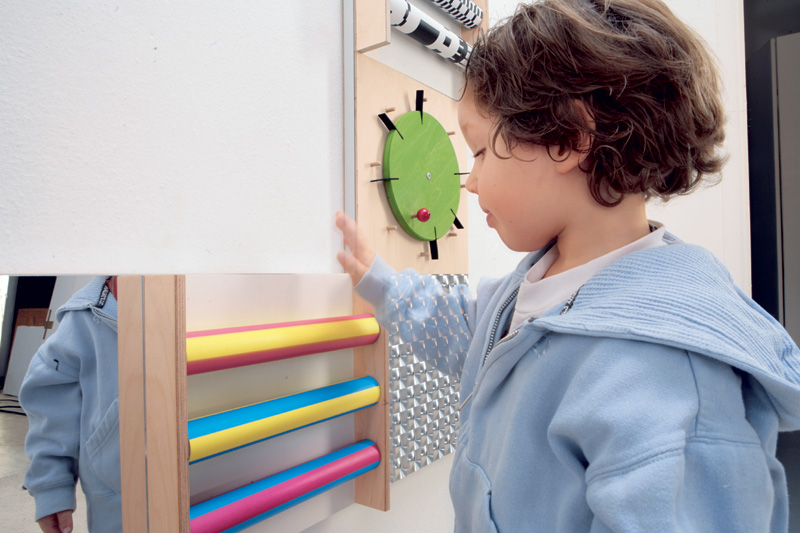 Стенен панел с елементи за слухова сензорна стимулация и зрително-моторна координация. Материали: дърво и метал Размери: 91х31 см