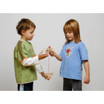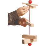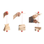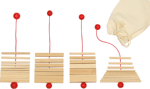 Съдържание / материали / размери: 4 дървени кули с дървени блокчета с различна дебелина. Блокчетата са нанизани на шнур, застопорен в двата края с дървени топчета. Съхраняват се в платнена торбичка.