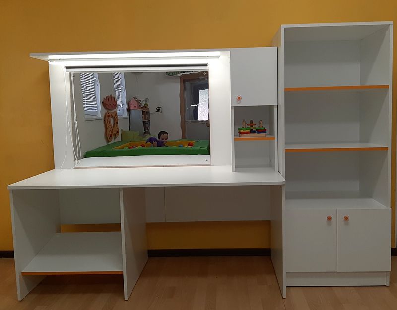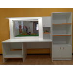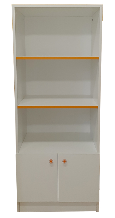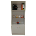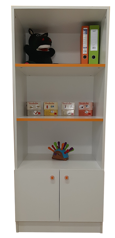 Висок шкаф с вратички и 2 рафта с цветен кант. Подходящ за оборудване на кабинет на логопед, психолог, специален педагог. Може да се комбинира с логопедично бюро (BLA2043).
