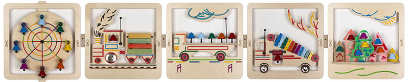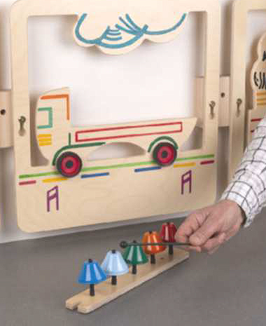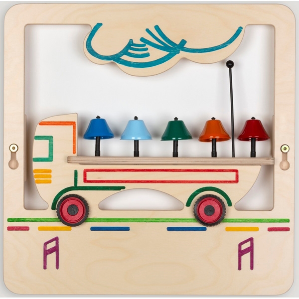 Музикален стенен панел за игра. Поставката с камбанките може да се сваля и да се използва отделно. Панелът може да се използва самостоятелно или в комбинация с другите музикални стенни панели от серията.