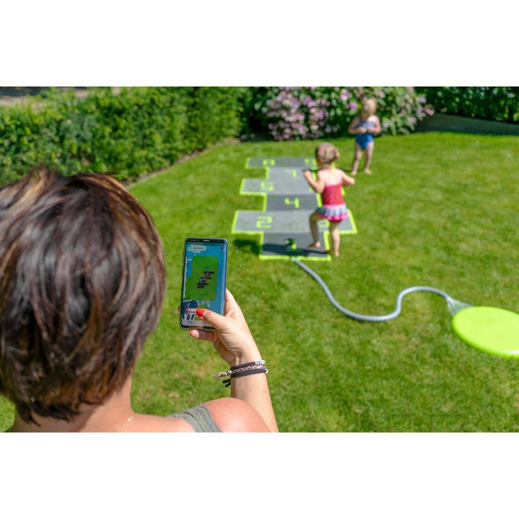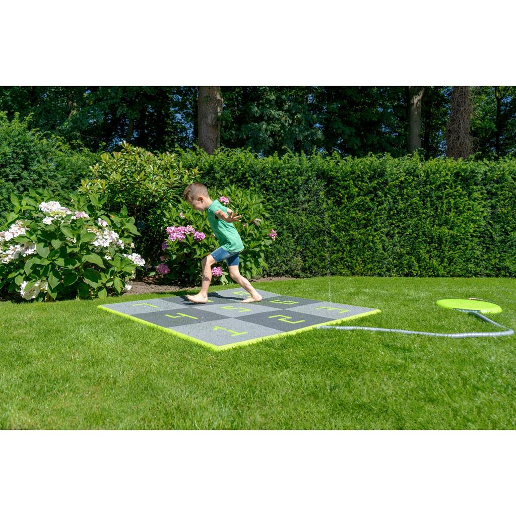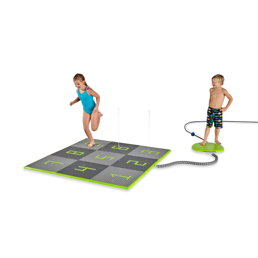 Комплектът водни плочки се състои от 9 водни плочки, 9 водни дюзи с маркуч, 1 конзола с регулатор на налягането, 1 бордюр (зелен) и 160 квадратчета. Монтажът е лесен за изпълнение. Подредете плочките в квадрат или като дама за скачане. Използвайте квадратчетата, за да поставите цифри, стрелки, букви или други символи върху повърхността.