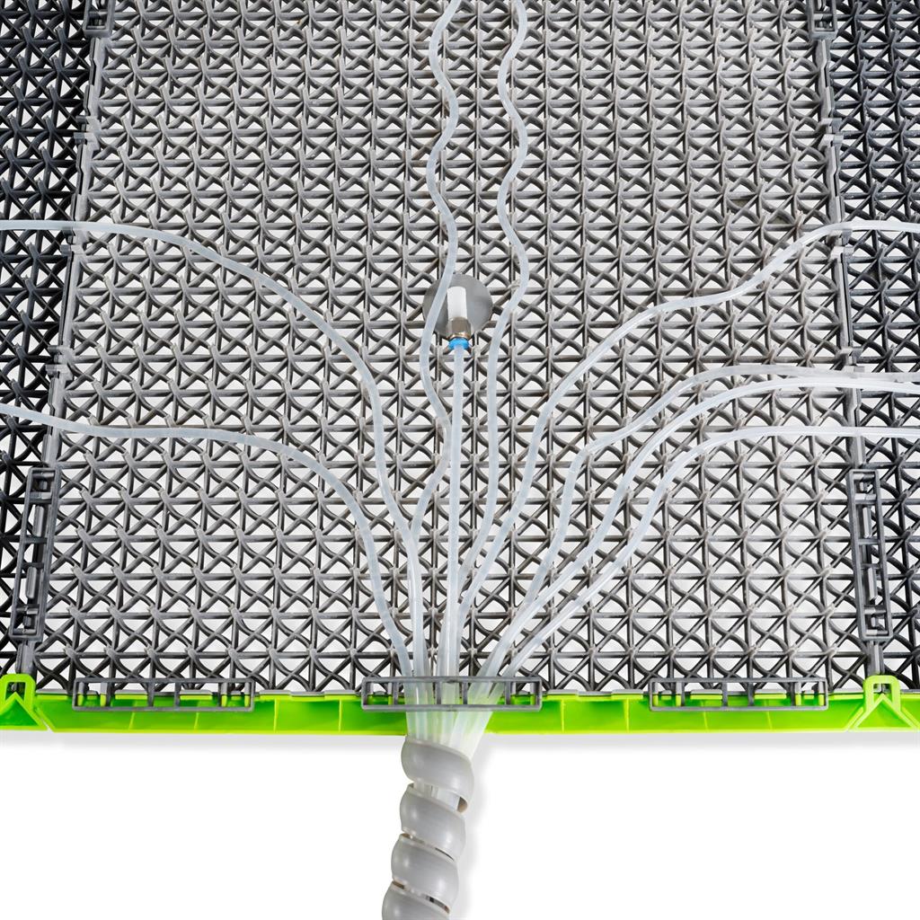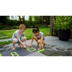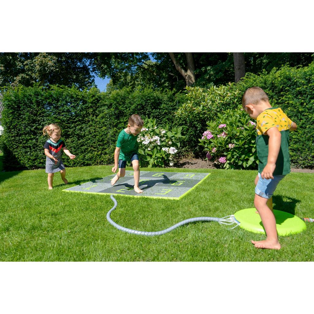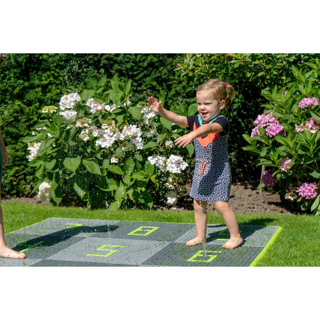 Комплектът водни плочки се състои от 9 водни плочки, 9 водни дюзи с маркуч, 1 конзола с регулатор на налягането, 1 бордюр (зелен) и 160 квадратчета. Монтажът е лесен за изпълнение. Подредете плочките в квадрат или като дама за скачане. Използвайте квадратчетата, за да поставите цифри, стрелки, букви или други символи върху повърхността.