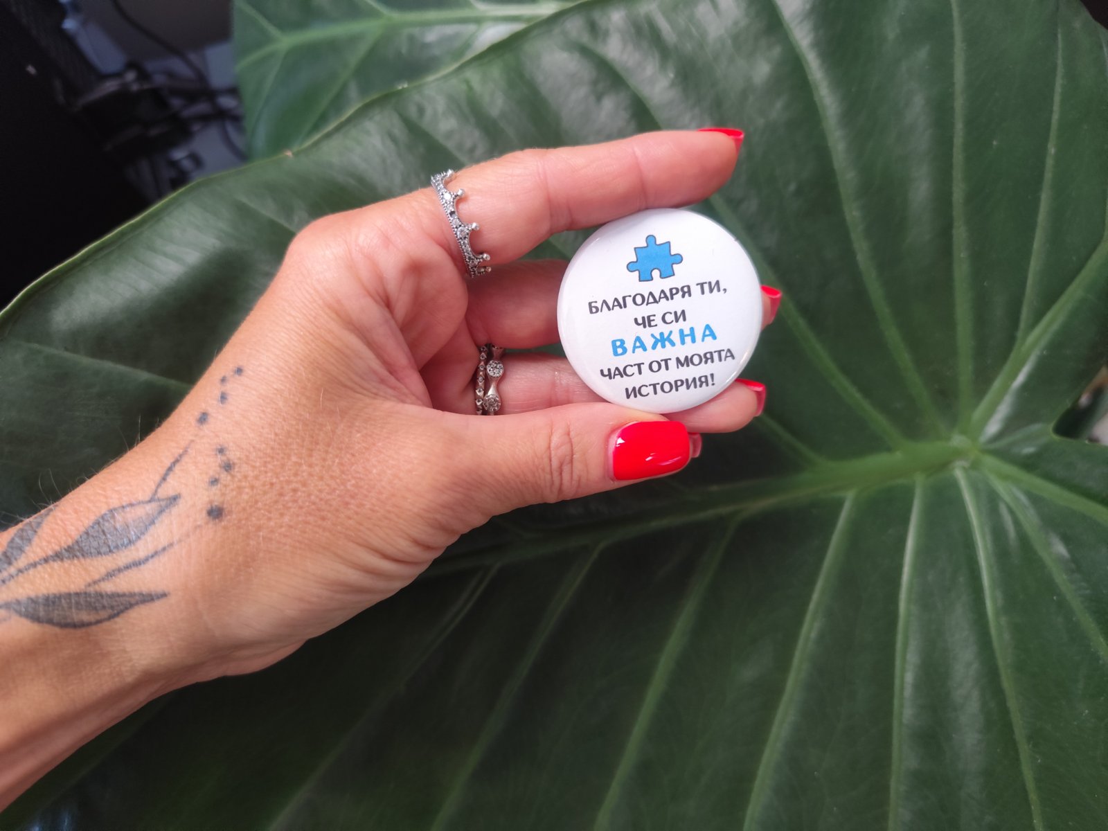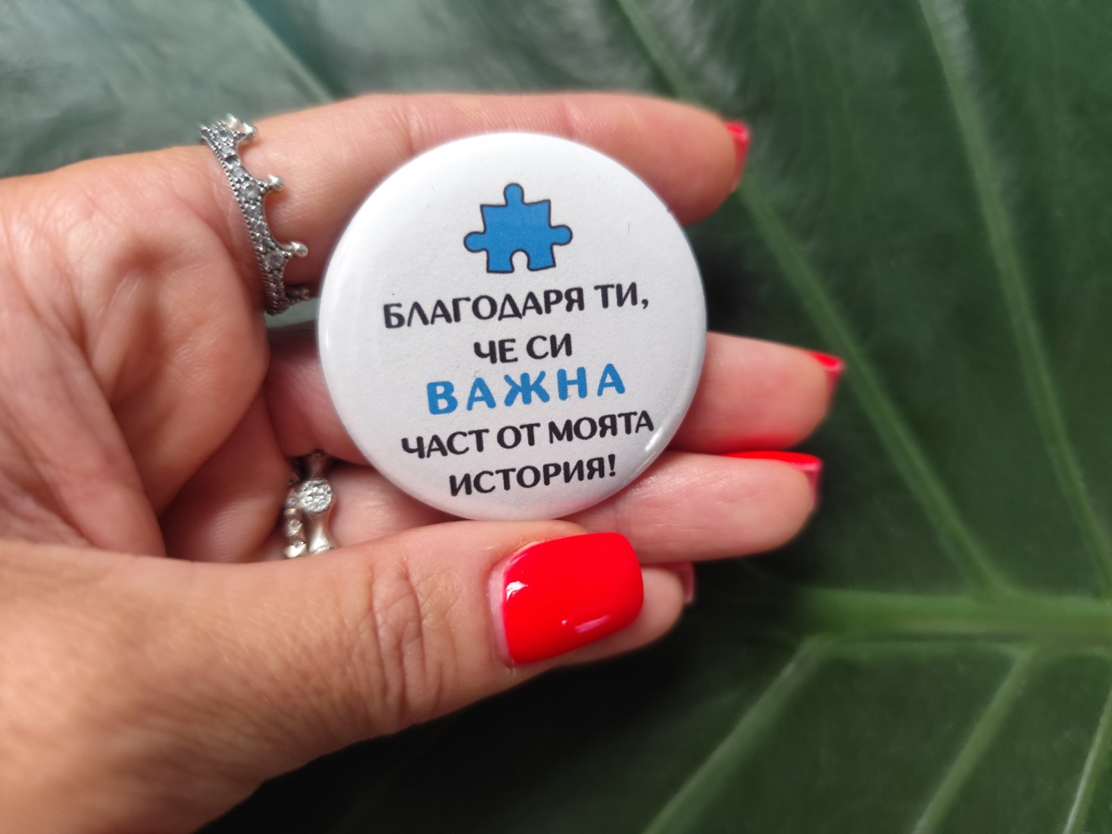 Значка със забавен текст: „Благодаря ти, че си важна част от моята история“.