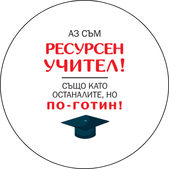 Значка със забавен текст: „Аз съм ресурсен учител! Също като останалите, но по-готин!“.