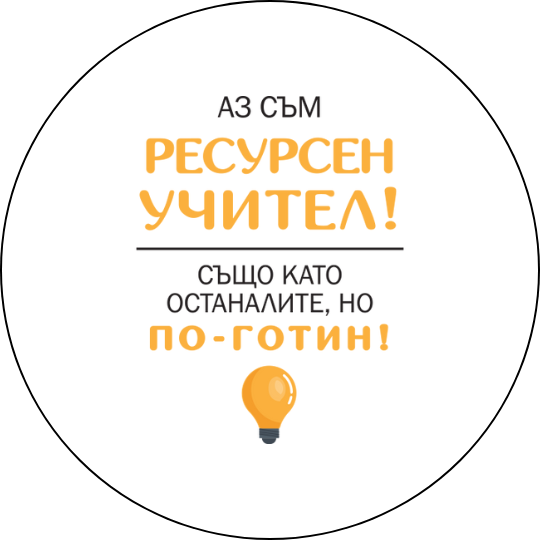 Значка със забавен текст: „Аз съм ресурсен учител! Също като останалите, но по-готин!“.
