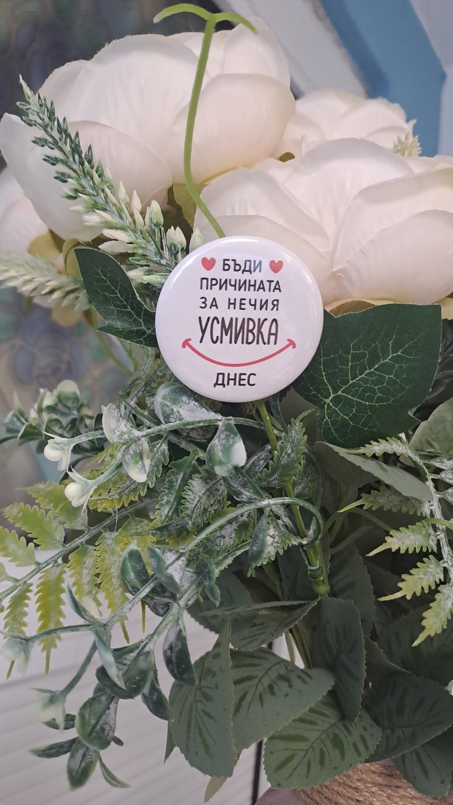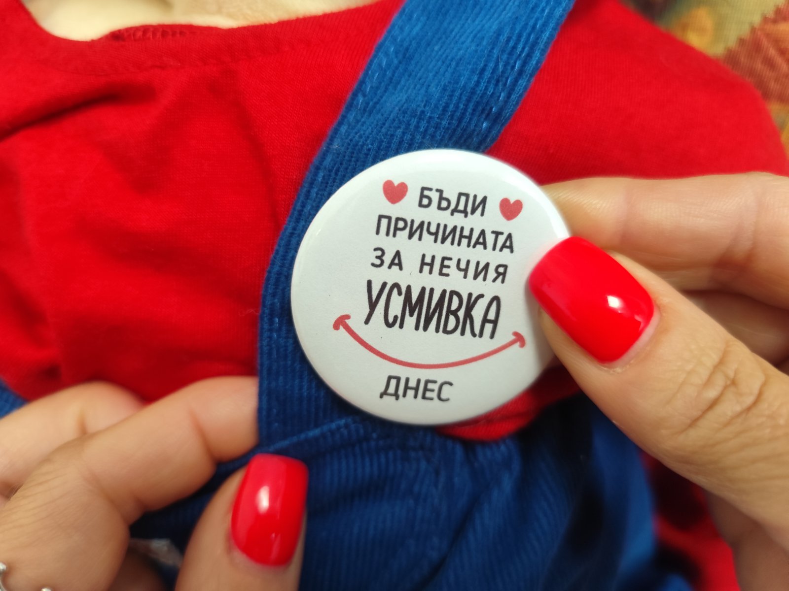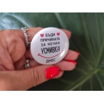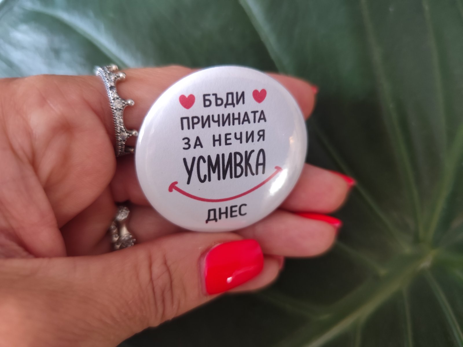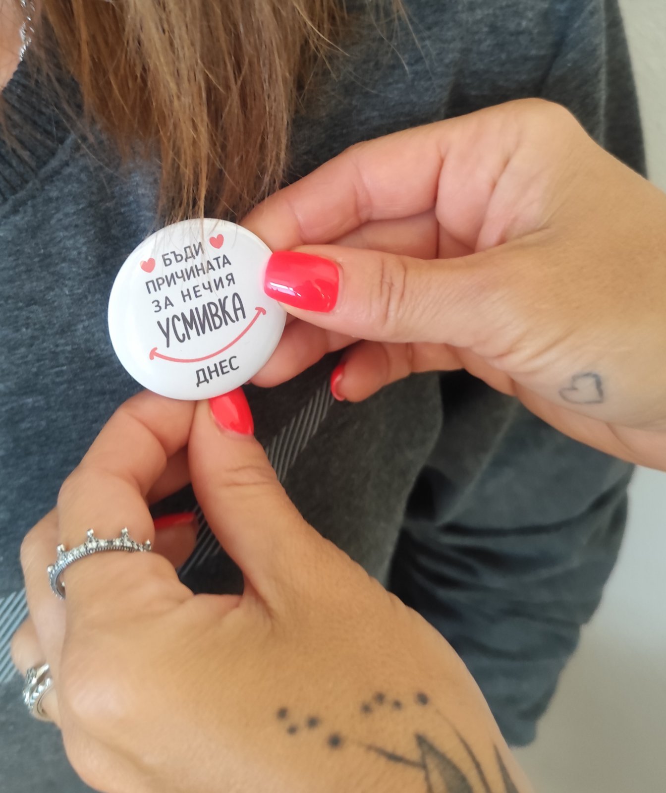 Значка със забавен текст: „Бъди причината за нечия УСМИВКА днес“.