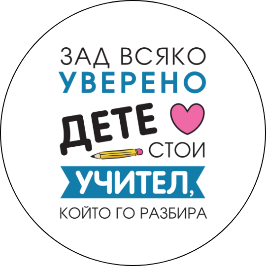 Значка със забавен текст: „Зад всяко уверено дете стои учител, който го разбира“.