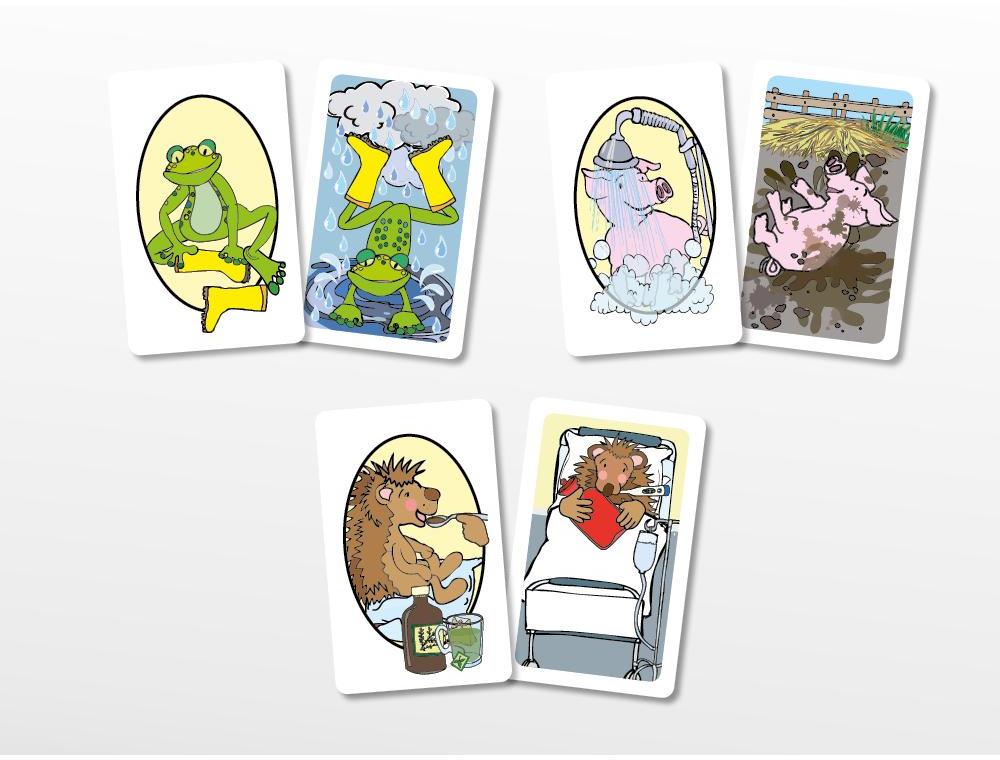 Забавна игра с карти, с която децата се упражняват да разпознават причинно-следствени връзки и да ги вербализират правилно, като образуват сложни изречения със съюза „защото“. Напр. Защо прасето се къпе? То се къпе, защото се е изцапало.