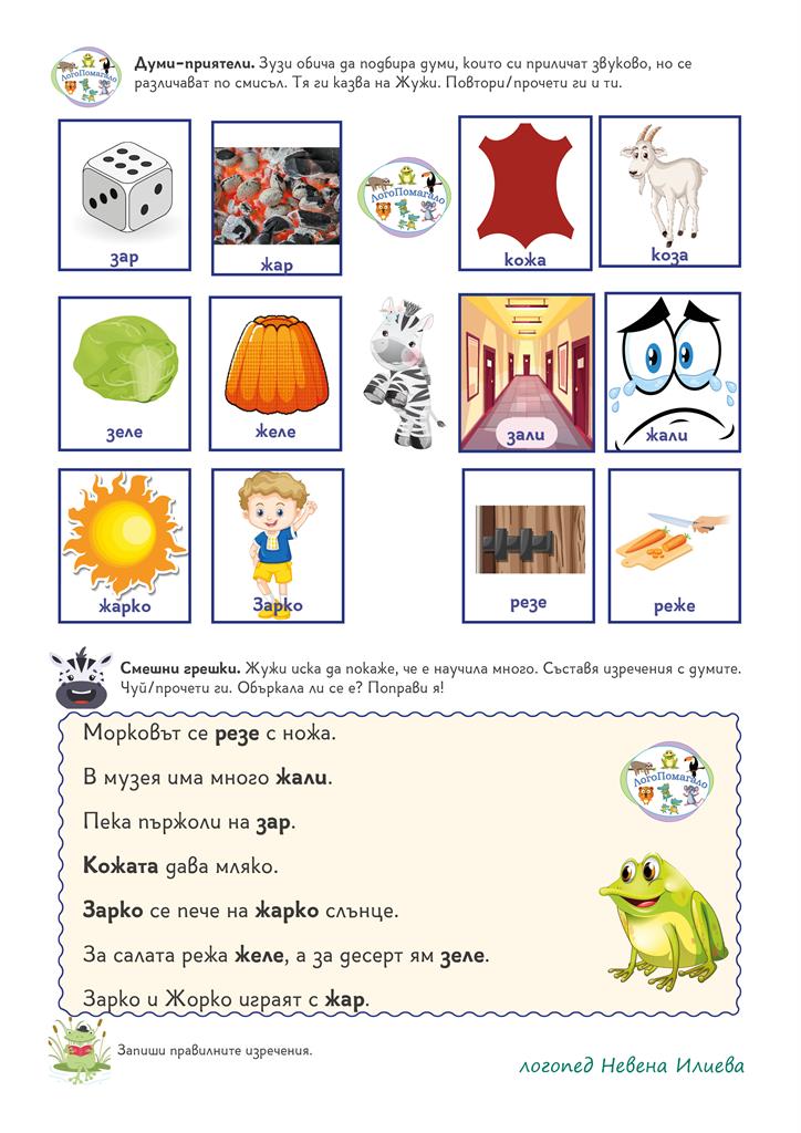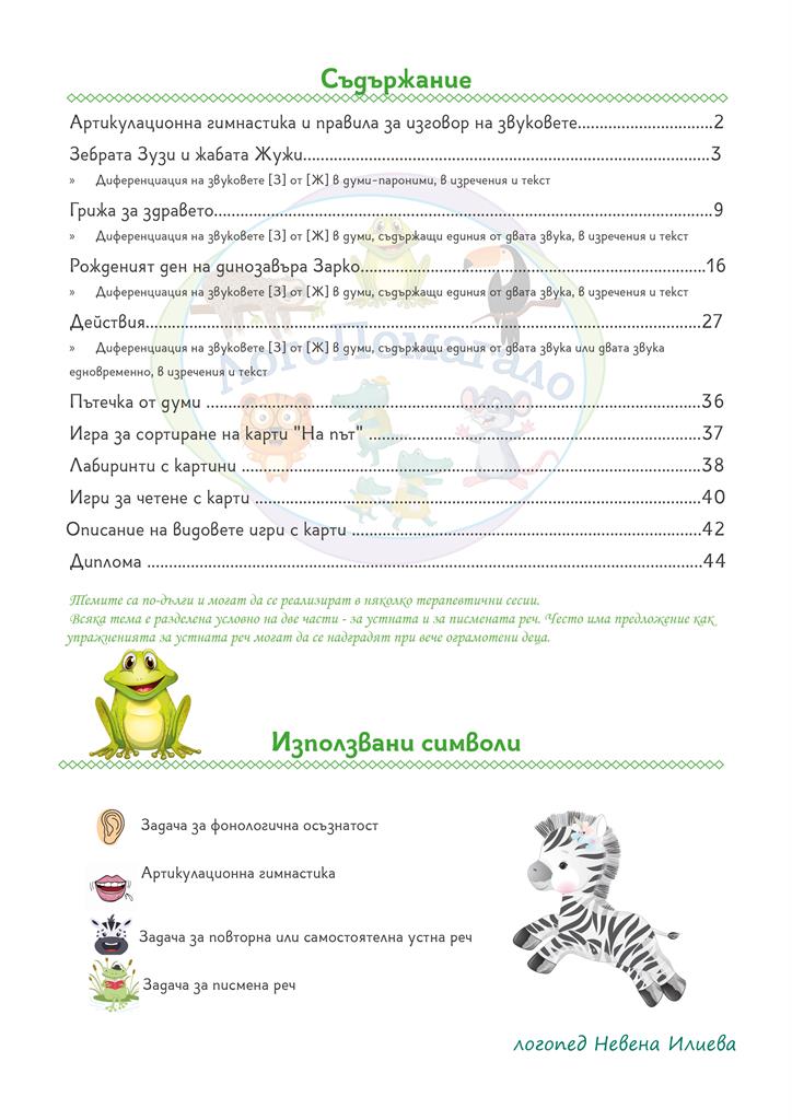 Съдържа упражнения за съпоставяне на звуковете [З] и [Ж] в устната и в писмената реч на ниво думи, изречение и текст. Задачите са богато онагледени, така че привличат и задържат активно вниманието на детето.