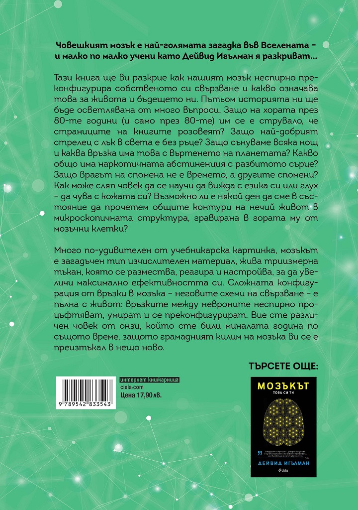 Тази книга ще ви разкрие как нашият мозък неспирно преконфигурира собственото си свързване и какво означава това за живота и бъдещето ни. Пътьом историята ни ще бъде осветлявана от много въпроси. Защо на хората през 80-те години (и само през 80-те) им се е струвало, че страниците на книгите розовеят? Защо най-добрият стрелец с лък в света е без ръце? Защо сънуваме всяка нощ и каква връзка има това с въртенето на планетата? Какво общо има наркотичната абстиненция с разбитото сърце? Защо врагът на спомена не е времето, а другите спомени? Как може сляп човек да се научи да вижда с езика си или глух – да чува с кожата си? Възможно ли е някой ден да сме в състояние да прочетем общите контури на нечий живот в микроскопичната структура, гравирана в гората му от мозъчни клетки?