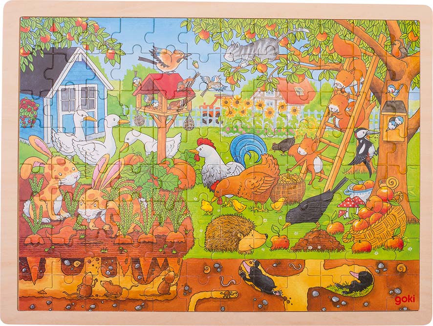 Пъзел в дървена рамка на тема „Животът в градината – под и над земята“. Съдържание: 96 елемента Материал: дърво Размери: 40х30х0,8 см