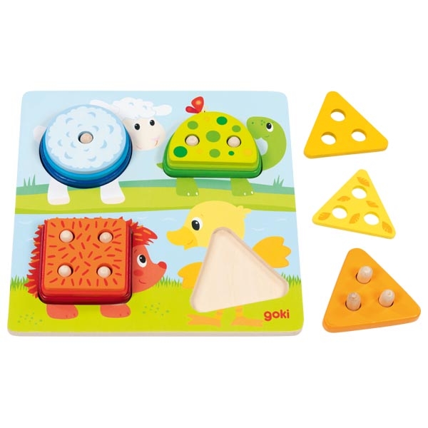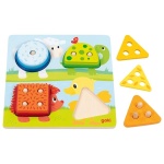 Животни – детски сортер с цветове, форми и количества е образователна дървена игра, създадена за най-ранното детско развитие. Чрез подреждане на елементите върху колчетата децата се запознават не само с различни цветове и геометрични форми, но и с понятието за количество. Всеки елемент има различен брой отвори, което насърчава първите стъпки в броенето и логическото мислене. Илюстрациите на животни правят играта интуитивна и привлекателна, а стабилните дървени части са удобни за хващане и напълно съобразени с възрастта на децата.